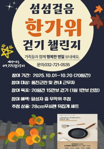 À̹ø °È±â 縰Áö´Â Ãß¼® ¿¬ÈÞ¸¦ Æ÷ÇÔÇÑ 10¿ù 1ÀϺÎÅÍ 20ÀϱîÁö ÃÑ 20Àϰ£, ºñ´ë¸é ¸ð¹ÙÀÏ °È±â ¾Û¡®¿öÅ©¿Â¡¯À» ÅëÇØ ¿ËÁø±º¹ÎÀº ´©±¸³ª ÀÚÀ¯·Ó°Ô Âü¿©ÇÒ ¼ö ÀÖ´Ù.