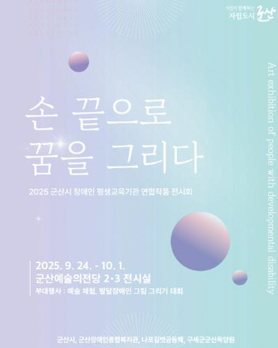 30ÀÏ¿¡´Â 2025 ±º»ê½Ã ¹ß´ÞÀå¾ÖÀÎ ±×¸²±×¸®±â ´ëȸ°¡ ±º»ê¿¹¼úÀÇÀü´ç 2¡¤3Àü½Ã½Ç ·Îºñ¿¡¼ ¿¸®¸ç, ½Ã¹ÎµéÀÌ ÇÔ²² Âü¿©ÇÒ ¼ö ÀÖ´Â ¿¹¼ú üÇè ºÎ½ºµµ ¿î¿µµÈ´Ù.