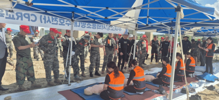 Âü°¡ÀÚµéÀº ·¹Æç ÁøÀÔ, ¼öÁß Å½»ö µî ±¸¸íº¸Æ®¿Í Àá¼ö Àåºñ¸¦ Ȱ¿ëÇÑ ÀͼöÀÚ ±¸Á¶ ¿ª·® ¹× ½ÉÆó¼Ò»ý¼ú°ú ÀÚµ¿½ÉÀåÃæ°Ý±â(AED) ½Ç½ÀÀ» ÅëÇØ ÀÀ±Þ»óȲ ´ëÀÀ ´É·ÂÀ» Á¡°ËÇß´Ù.