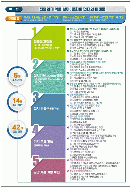 ºñÀüÀº ¡°ÀüÀïÀÇ ±â¾ïÀ» ³Ñ¾î, ÆòÈ¿Í ¿¬´ëÀÇ ¹Ì·¡·Î¡± À̸ç, À̸¦ ½ÇÇöÇϱâ À§ÇÑ 3´ë ÃßÁø¹æÇâÀ¸·Î ¡ã±â¾ïÀ» °è½ÂÇÏ´Â °ø°øÀÇ Àå¼Ò ÁöÇâ ¡ãÆòȱ³À° Ç÷§Æû ÁöÇâ ¡ã±¹Á¦Æòȵµ½Ã ÀÎõ ºê·£µåÈ ÁöÇâÀ» Á¦½ÃÇß´Ù. ¶Ç À̸¦ ±¸Ã¼ÈÇϱâ À§ÇØ 5´ë ÃßÁøÀü·«, 14°³ ÃßÁø¹æ¾È, 42°³ ½Çõ°úÁ¦°¡ ¸¶·ÃµÆ´Ù.