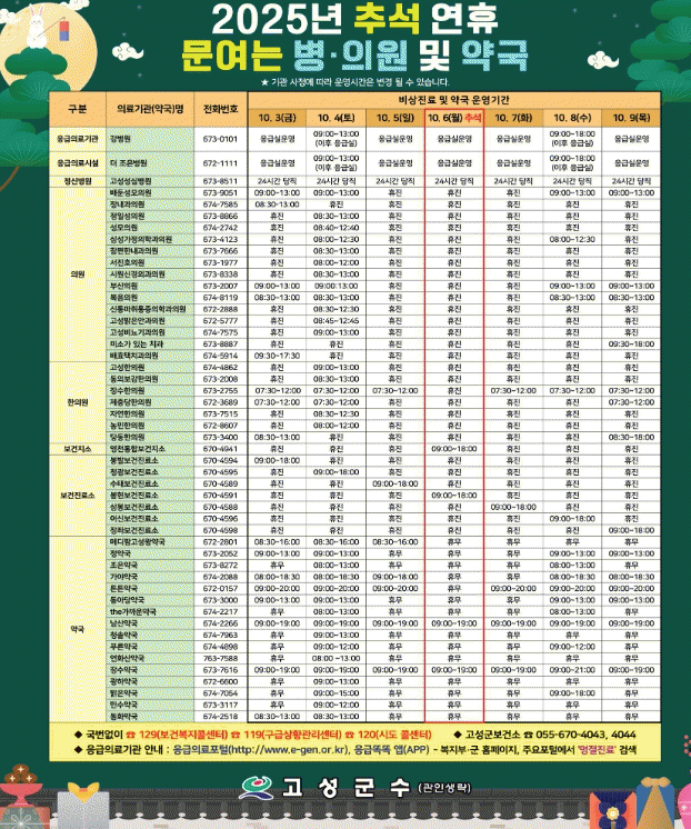 ¿¬ÈÞ ±â°£ Áß ¹®À» ¿©´Â º´¡¤ÀÇ¿ø ¹× ¾à±¹ ¾È³»´Â 129(º¸°Çº¹Áö Äݼ¾ÅÍ), 119(±¸±Þ»óȲ °ü¸®¼¾ÅÍ), 120(µµ Äݼ¾ÅÍ)¿Í ¡®ÀÀ±ÞÀÇ·áÆ÷ÅС¯ÀÀ±ÞÀÇ·á Á¤º¸Á¦°ø ¾Û ¡®ÀÀ±Þ¶È¶È¡¯, °í¼º±ºÃ» ȨÆäÀÌÁö, °í¼º±º ¹êµå(SNS) µîÀ» ÅëÇØ È®ÀÎÇÒ ¼ö ÀÖ´Ù.