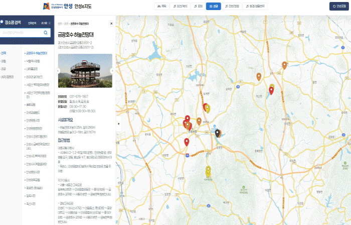 PC³ª ¸ð¹ÙÀÏ À¥ ºê¶ó¿ìÀú¿¡¼ ¾È¼º½Ã ´ëÇ¥Æ÷Åп¡ Á¢¼Ó ÈÄ »ç¿ëÀÌ °¡´ÉÇϸç, °ü½É ÀÖ´Â Ä«Å×°í¸®(°ü±¤Áö¡¤°ø°ø½Ã¼³¡¤±³Åë µî)¸¦ Ŭ¸¯Çϸé À§Ä¡ Á¤º¸¿Í ´õºÒ¾î ÇØ´ç ½Ã¼³ÀÇ ¿î¿µ½Ã°£¡¤¿¬¶ô󡤯íÀǽü³ µî »ó¼¼ Á¤º¸µµ ÇÔ²² È®ÀÎÇÒ ¼ö ÀÖ´Ù.