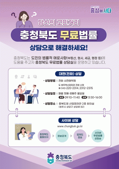 ¶ÇÇÑ, ¹«·á¹ý·ü»ó´ã¿¡ ´ëÇÑ µµ¹ÎµéÀÇ ÆíÀǼº°ú Á¢±Ù¼ºÀ» ³ôÀ̱â À§ÇÏ¿© ¡º»çÀ̹ö ¹«·á¹ý·ü»ó´ã½Ç¡»À» ¿î¿µÇϰí Àִµ¥, ÃæÃ»ºÏµµ ȨÆäÀÌÁö-Á¤º¸°ø°³-¹ý/Á¦µµÁ¤º¸-»çÀ̹ö ¹«·á¹ý·ü»ó´ã½Ç Á¢¼Ó ÈÄ ¹ýÀûÀ¸·Î ±Ã±ÝÇÑ »çÇ×À» ÀÛ¼ºÇÏ¸é »ó´ã°üÀÇ ºü¸¥ ´äº¯À» ¹Þ¾Æº¼ ¼ö ÀÖ´Ù.