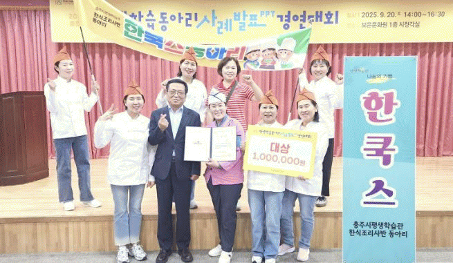 ÇÑÀº°æ ȸÀåÀº ¡°È¸¿ø ¸ðµÎ°¡ ¡®¹è¿î °ÍÀ» ³ª´©ÀÚ¡¯¶ó´Â ¸¶À½À¸·Î Ȱµ¿ÇØ ¿Â °á°ú À̹ø ¼ö»óÀ¸·Î ÀÎÁ¤¹Þ¾Æ ¸Å¿ì ¶æ±í´Ù¡±¶ó¸ç ¡°¾ÕÀ¸·Î´Â ´Ü¼øÇÑ ¿ä¸® Ȱµ¿À» ³Ñ¾î ÃæÁÖÀÇ À½½Ä¹®È¸¦ ¿¬±¸¡¤±â·ÏÇϰí, Áö¿ª°ú ÇÔ²²ÇÏ´Â ¡®ÃæÁÖ À½½Ä¹®È ¿¬±¸È¸¡¯·Î ¹ßÀüÇØ ³ª°¡°Ú´Ù¡±¶ó°í ¹àÇû´Ù.