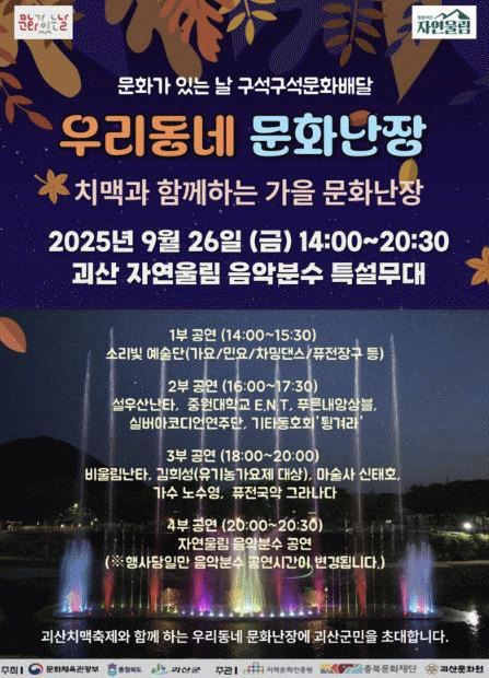 ¹«´ë¿¡´Â Áö¿ª ¿¹¼úÀÎÀ» ºñ·ÔÇØ ´Ù¾çÇÑ ºÐ¾ßÀÇ °ø¿¬ÁøÀÌ ÇÔ²²ÇÑ´Ù. Ç»Àü±¹¾Ç ±×·ì ¡®±×¶ó³ª´Ù¡¯ÀÇ ¹«´ë¿Í ÇÔ²², °¡¼ö ³ë¼ö¿µ, ¸¶¼ú»ç ½ÅÅÂÈ£, ûÁÖ¼Ò¸®ºû¿¹¼ú´Ü, ±×¸®°í Á¦3ȸ ±«»êÀ¯±â³ó°¡¿äÁ¦ ´ë»ó ¼ö»óÀÚ ±èÈñ¼ºÀÇ °ø¿¬ µî ´Ùä·Î¿î º¼°Å¸®°¡ ¸¶·ÃµÅ ÀÖ´Ù. ¿ÀÈÄ 8½ÃºÎÅÍ´Â ¡®ÀÚ¿¬¿ï¸² À½¾ÇºÐ¼ö¡¯ °ø¿¬ÀÌ ´ë¹Ì¸¦ Àå½ÄÇÒ ¿¹Á¤ÀÌ´Ù.