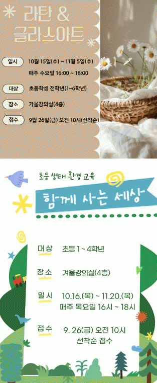 À̹ø ÇÁ·Î±×·¥Àº »ýÅ ¼ö¾÷°ú °ø¿¹ ¼ö¾÷ µÎ °¡Áö °Á·Π¿î¿µµÇ¸ç, »ýÅ ¼ö¾÷Àº 10¿ù 16ÀϺÎÅÍ 11¿ù 20ÀϱîÁö ¸ÅÁÖ ¸ñ¿äÀÏ¿¡ ÃʵîÇб³ 1~4ÇгâÀ» ´ë»óÀ¸·Î ¿î¿µµÇ¸ç ¡®ÇÔ²² »ç´Â ¼¼»ó¡¯À» ÁÖÁ¦·Î °¡À»°ú °Ü¿ïÀÇ »ýŸ¦ ޱ¸ÇÑ´Ù.