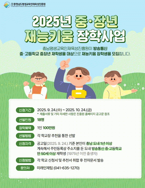 Áß¡¤Àå³â Àç´ÉŰ¿ò ÀåÇлç¾÷ Áö¿ø ÀÚ°ÝÀº Ãæ³²¿¡ 1³â ÀÌ»ó °ÅÁÖÇϰí ÀÖ´Â ¸¸ 50¼¼ ÀÌ»ó ¹æ¼ÛÅë½Å Áß¡¤°í±³ ÀçÇлýÀ¸·Î Çб³Àå ÃßõÀ» ÅëÇØ ¼±¹ßµÉ ¿¹Á¤À̸ç, Á¢¼ö¹æ¹ýÀº °¢ Çб³¸¦ ÅëÇØ Á¢¼öÇÒ ¼ö ÀÖ´Ù.