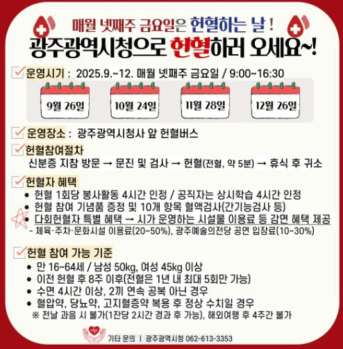 ±¤Áֽô ¿ÃÇØ 9¿ùºÎÅÍ 12¿ù±îÁö ¸Å¿ù ³Ý° ÁÖ ±Ý¿äÀÏÀ» ¡®ÇåÇ÷ Âü¿©ÀÇ ³¯¡¯·Î Á¤Çϰí, ´ëÇÑÀû½ÊÀÚ»ç ±¤ÁÖ¡¤Àü³²Ç÷¾×¿ø°ú Çù·ÂÇØ ¿ÀÀü 9½ÃºÎÅÍ ¿ÀÈÄ 4½Ã30ºÐ±îÁö û»ç ¾Õ ½Ã¹Î±¤Àå¿¡ ÇåÇ÷¹ö½º¸¦ ¹èÄ¡¡¤¿î¿µÇÑ´Ù.