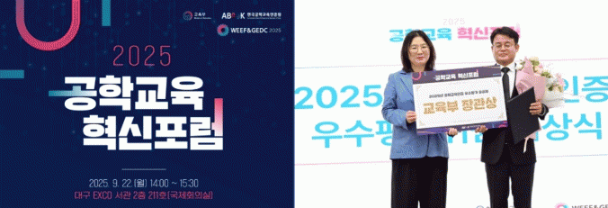 26ÀÏ Àü³²´ë¿¡ µû¸£¸é, °ø°ú´ëÇÐ Àå¹Îö ±³ÇкÎÇÐÀå(°íºÐÀÚÀ¶ÇÕ¼ÒÀç°øÇкΠ±³¼ö?°øÇб³À°¿¬±¸¼¾ÅÍÀå)ÀÌ Áö³ 9¿ù 22ÀÏ ´ë±¸ EXCO¿¡¼ ¿¸° ¡®2025 °øÇб³À° Çõ½ÅÆ÷·³¡¯¿¡¼ ±³À°ºÎÀå°ü»óÀ» ¼ö»óÇß´Ù.