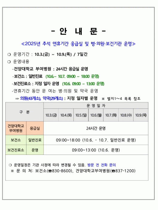 ¿¬ÈÞ ±â°£¿¡´Â Áö¿ªÀÀ±ÞÀÇ·á±â°üÀÎ °Ç¾ç´ëÇб³ ºÎ¿©º´¿ø ÀÀ±Þ½ÇÀÌ 24½Ã°£ ¿î¿µµÇ¸ç, °ü³» º´ÀÇ¿ø 43°³¼Ò¿Í ¾à±¹ 29°³¼Ò¸¦ ¡®¹® ¿©´Â º´ÀÇ¿ø°ú ¾à±¹¡¯À¸·Î ÁöÁ¤¡¤¿î¿µÇÏ¿© Áø·á °ø¹éÀ» ÃÖ¼ÒÈÇÒ °èȹÀÌ´Ù.