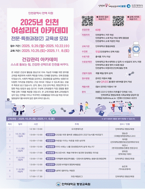 ÀÚ¼¼ÇÑ »çÇ×Àº ÀÎõ±¤¿ª½Ã ´©¸®Áý°ú ÀÎÇÏ´ëÇб³ Æò»ý±³À°¿ø ´©¸®Áý¿¡¼ È®ÀÎÇÒ ¼ö ÀÖÀ¸¸ç, ±³À° ½ÅûÀº ¿Â¶óÀÎ Á¢¼ö[Á¤º¸¹«´Ì(QRÄÚµå Âü°í)]¸¦ ÅëÇØ °£ÆíÇÏ°Ô ÁøÇàÇÒ ¼ö ÀÖ´Ù.