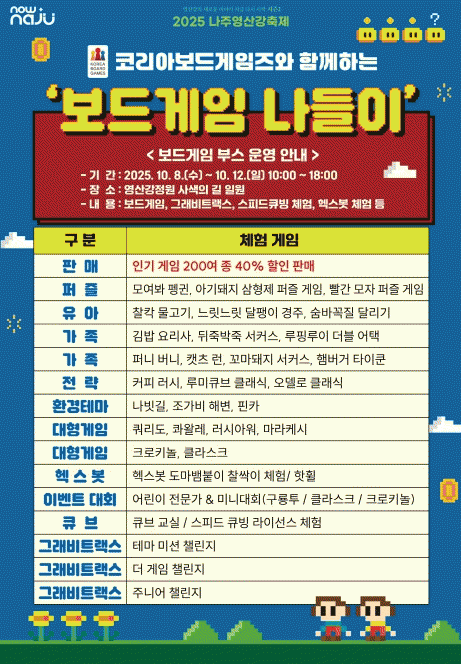 ÇÑÆí ¡®º¸µå°ÔÀÓ ³ªµéÀÌ¡¯ ÇÁ·Î±×·¥ÀÇ ÀÚ¼¼ÇÑ ÀÏÁ¤°ú ³»¿ëÀº ³ªÁÖ¿µ»ê°ÃàÁ¦ °ø½Ä ºí·Î±×¿Í SNS ä³ÎÀ» ÅëÇØ È®ÀÎÇÒ ¼ö ÀÖ´Ù.