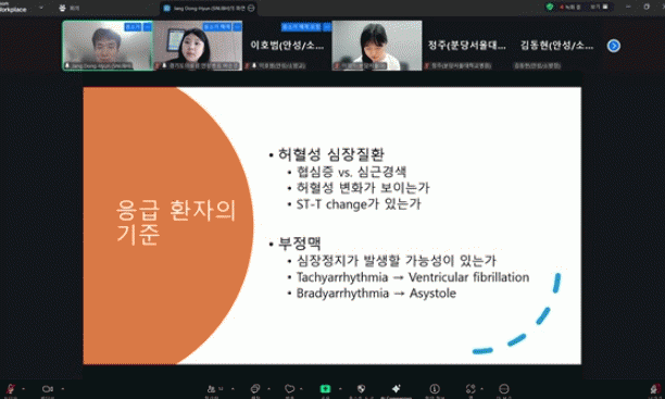Zoom ºñ´ë¸é Ç÷§ÆûÀ» ÅëÇØ ºÐ´ç¼Ò¹æ¼, ¿©ÁÖ¼Ò¹æ¼, ¾È¼º¼Ò¹æ¼, ¼Ûź¼Ò¹æ¼ ±¸±Þ´ë¿øÀÌ µ¿½Ã¿¡ Âü¿©ÇÒ ¼ö ÀÖµµ·Ï ±³À°ÀÌ ¿î¿µµÆ´Ù. À̹ø ±³À°Àº ¡ã´Ù¼ö»ç»óÀÚ»ç°í(MCI)ÀÇ °³³ä°ú ±¸±Þ´ë¿øÀÌ ¹Ýµå½Ã ¼÷ÁöÇØ¾ß ÇÒ ÁßÁõµµ ºÐ·ù(Triage) ¿øÄ¢ ¹× ´ëÀÀ ÀýÂ÷ ¡ã¿ø¸®¿Í ÇÔ²² ÀÌÇØÇÏ´Â ±âÃÊ ½ÉÀüµµ ¡ãÀÀ±ÞȯÀÚÀÇ ±âÁØ(ÇãÇ÷¼º ½ÉÀåÁúȯ, ºÎÁ¤¸Æ) µîÀ» Áß½ÉÀ¸·Î ÁøÇàµÆÀ¸¸ç, ƯÈ÷ ±¸±Þ´ë¿øÀÌ ½ÇÁ¦ ÇöÀå¿¡¼ Àû¿ëÇÒ ¼ö ÀÖ´Â ÀÌ·ÐÀû ±âÁذú ÆÇ´Ü ±Ù°Å¸¦ ½ÉÈ ÇнÀÇÏ´Â µ¥ ÃÊÁ¡À» ¸ÂÃß¾ú´Ù.