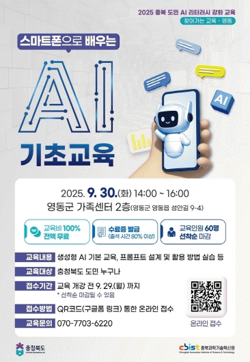 À̹ø ±³À°Àº ÃæºÏ µµ¹ÎÀ̶ó¸é ´©±¸³ª Âü¿©ÇÒ ¼ö ÀÖÀ¸¸ç, »ý¼ºÇü AI ±âº» °³³ä°ú ÇÁ·ÒÇÁÆ® ¼³°è ¹× Ȱ¿ë ¹æ¹ýÀ» ½Ç½À Áß½ÉÀ¸·Î ´Ù·é´Ù. ±³À°ºñ´Â Àü¾× ¹«·áÀ̸ç, Ãâ¼® ½Ã°£ÀÇ 80% ÀÌ»óÀ» À̼öÇÏ¸é ¼ö·áÁõµµ ¹ß±ÞµÈ´Ù. ¸ðÁý ÀοøÀº 60¸íÀ¸·Î, ¼±Âø¼ø ¸¶°¨µÈ´Ù.
