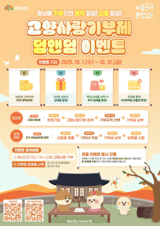 °íÇâ»ç¶û±âºÎÁ¦ÀÇ È°¼ºÈ¸¦ À§ÇØ ¸¶·ÃÇÑ À̹ø À̺¥Æ®´Â µµ¿Í 7°³ ½Ã±º¿¡ 10¸¸¿ø ÀÌ»ó ±âºÎ ½Ã ±âÁ¸ 10¸¸¿ø ¼¼¾×°øÁ¦¿Í 3¸¸¿ø »ó´ç ´ä·Êǰ ¿Ü¿¡ ƯÁ¤ ´ä·Êǰ ¼±Åà ½Ã ´ýÀ¸·Î Ãß°¡ ´ä·ÊǰÀ» ÁõÁ¤ÇÑ´Ù.