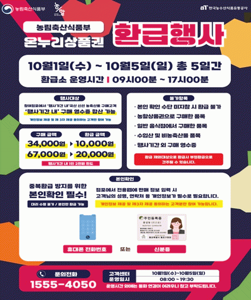 Çà»ç ±â°£ µ¿¾È ±¹³»»ê ½Å¼± ³ó¡¤Ãà»ê¹°À» ±¸¸ÅÇÑ ¼ÒºñÀÚ´Â ±¸¸Å ±Ý¾×¿¡ µû¶ó ÃÖ´ë 30% À̳»¿¡¼ 1Àδç ÃÖ´ë 2¸¸ ¿ø±îÁö ¿Â´©¸®»óǰ±ÇÀ» ȯ±Þ¹ÞÀ» ¼ö ÀÖÀ¸¸ç, ±¸¸Å±Ý¾× 3¸¸ 4õ ¿ø ÀÌ»ó 6¸¸ 7õ ¿ø ¹Ì¸¸Àº 1¸¸ ¿ø, 6¸¸ 7õ ¿ø ÀÌ»óÀº 2¸¸ ¿øÀÌ È¯±ÞµÇ°í, ¿¹»ê ¼ÒÁø ½Ã Çà»ç´Â Á¶±â Á¾·áµÉ ¼ö ÀÖ´Ù.