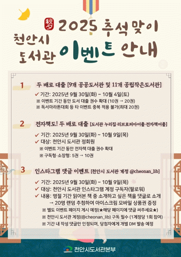 õ¾È½Ã 9°³ °ø°øµµ¼°ü°ú 11°³ °ø¸³ÀÛÀºµµ¼°üÀº ¿À´Â 9¿ù 30ÀϺÎÅÍ 10¿ù 4ÀϱîÁö µµ¼ ´ëÃ⠱Ǽö¸¦ ÃÖ´ë 20±Ç±îÁö ºô¸± ¼ö ÀÖ´Â ¡®µÎ ¹è·Î ´ëÃ⡯ Çà»ç¸¦ ÁøÇàÇÑ´Ù. ÀüÀÚÃ¥Àº 10¿ù 9ÀϱîÁö µÎ ¹è ´ëÃâÀÌ °¡´ÉÇÏ´Ù.