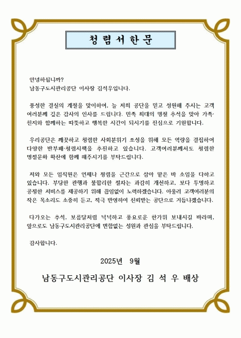 ±è¼®¿ì ÀÌ»çÀåÀº ¡°Ã»·Å ¼Çѹ® ¹ß¼ÛÀ¸·Î °ø´Ü°ú ¾÷ü °£ÀÇ Ã»·ÅÇÑ °ü°è¸¦ À¯ÁöÇÔÀº ¹°·Ð, Àü Á÷¿øÀÇ Ã»·Å ¹®È Á¤ÂøÀ» ÅëÇØ Åõ¸íÇÑ °ø´Ü ±¸ÇöÀ» À§ÇØ ÃÖ¼±À» ´ÙÇϰڴ١±¶ó°í ¸»Çß´Ù.