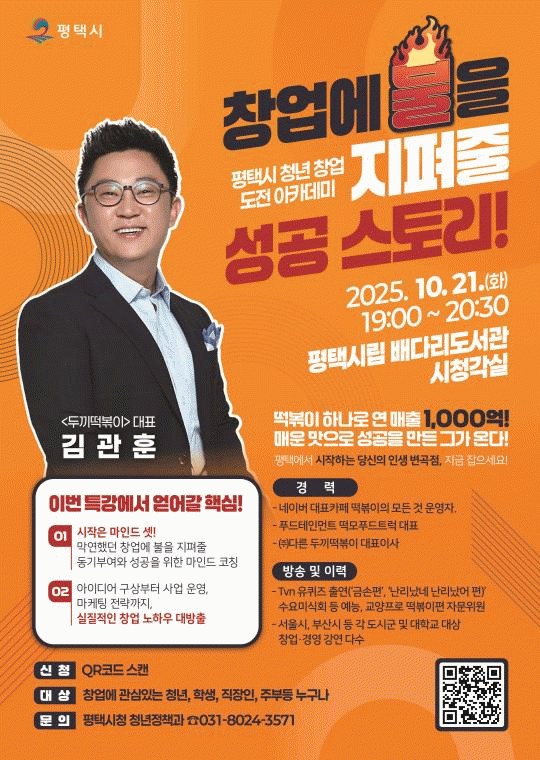 Ư°Àº â¾÷¿¡ °ü½ÉÀÌ Àִ û³â, Çлý, ÁÖºÎ, Á÷ÀåÀÎ ´©±¸³ª Âü¿©ÇÒ ¼ö ÀÖ´Ù. ½Åû ¹× ¹®ÀÇ´Â ÆòÅýà û³âÁ¤Ã¥°ú(031-8024-3571)·Î ÀüÈÇÏ¸é µÈ´Ù.