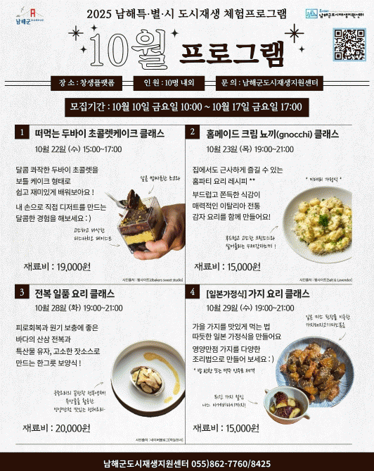 ÇÁ·Î±×·¥Àº ¡â¿Àºì ¾øÀÌ ¸¸µå´Â¡®¶°¸Ô´Â µÎ¹ÙÀÌ ÃÊÄÝ·¿ ÄÉÀÌÅ© Ŭ·¡½º(10/22)¡¯, ¡âÀÌÅ»¸®¾Æ ÀüÅë °¨Àڿ丮 ¡®È¨¸ÞÀ̵å Å©¸² ´¢³¢ Ŭ·¡½º(10/23)¡¯, ¡âÁö¿ª Ư»ê¹°ÀÎ À¯ÀÚ¿Í Àã¼Ò½º·Î ¿Ï¼ºÇÏ´Â ¡®Àüº¹ ÀÏǰ¿ä¸® Ŭ·¡½º(10/28)¡¯, ¡â°¡À» °¡Áö¸¦ Ȱ¿ëÇÑ ¡®ÀϺ» °¡Á¤½Ä Ŭ·¡½º(10/29)¡¯µî ÃÑ 4°³ °Á·Π±¸¼ºµÆ´Ù.