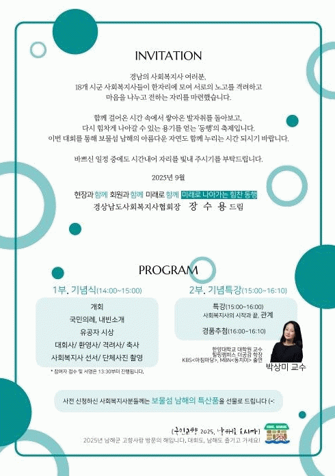 ³²Çرº°ú °æ»ó³²µµ»çȸº¹Áö»çÇùȸ°¡ ÁÖÃÖÇϰí, °æ³²»çȸº¹Áö»çÇùȸ°¡ ÁÖ°üÇÏ´Â À̹ø ´ëȸ¿¡´Â ÇöÀåÀÇ ÃÖÀϼ±¿¡¼ ÀÌ¿ôÀÇ ¿ïŸ¸® ¿ªÇÒÀ» ÇØ ¿Â µµ³» »çȸº¹Áö»çµéÀÌ ´ë°Å Âü¼®ÇÒ ¿¹Á¤ÀÌ´Ù.