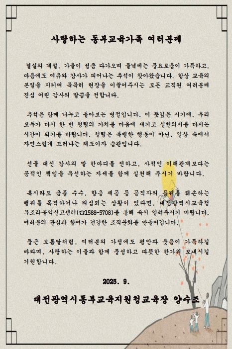 ´ëÀü¼ºÎ±³À°Áö¿øÃ» À±Á¤º´ ±³À°ÀåÀº ¡°´Ù°¡¿À´Â Ãß¼® ¸íÀý¿¡µµ û·ÅÀ» °¡±îÀÌÇÏ¸ç ¼ÒÁßÇÑ »ç¶÷µé°ú ÇÔ²² Áñ°Ì°Ô º¸³»½Ã±â¸¦ ¹Ù¶õ´Ù¡±¸ç ¡°±³À°°¡Á· ¸ðµÎ°¡ ÇÔ²² ¸¸µé¾î°¡´Â û·ÅÇÑ ´ëÀü±³À°ÀÌ µÉ ¼ö ÀÖµµ·Ï Áö¼ÓÀûÀ̸ç Àû±ØÀûÀΠû·ÅÁ¤Ã¥À» ÃßÁøÇϰڴ١±¶ó°í ¸»Çß´Ù.