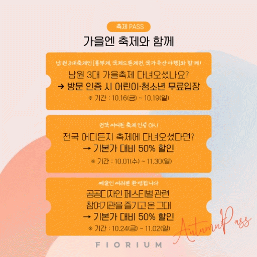 Çѱ¹°ü±¤°ø»ç ¡®¿©Çà°¡´Â °¡À» ÇÁ·Î¸ð¼Ç¡¯°úµµ ÇÔ²²ÇÑ´Ù. 10¿ù, 11¿ù µÎ ´Þ°£ ¡®¿©Çà°¡´Â °¡À» ³²¿ø¡¯À» ÅëÇØ ³²¿ø½Ã¹Î°ú µ¿ÇàÀÎ ¹«·áÀÔÀå, ŸÁö¿ª(Àü±¹) ÃàÁ¦ ¹æ¹® ÀÎÁõ ½Ã 50% ÇÒÀÎ µî ´Ù¾çÇÑ ¸ÂÃãÇü ÇýÅÃÀ» ¼±º¸ÀδÙ.