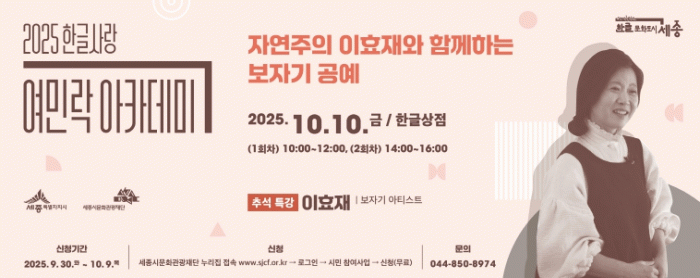 ¹«·á·Î ÁøÇàµÇ´Â À̹ø Ưº°°Á´ ¿ÀÀü 10½Ã¿Í ¿ÀÈÄ 2½Ã, °¢ ȸÂ÷º°·Î 20¸í¾¿ ¸ðÁýÇÑ´Ù. Àå¼Ò´Â ´Ù¾çÇÑ Çѱ۹®È¸¦ °æÇèÇÒ ¼ö ÀÖ´Â ÇѱۻóÁ¡À¸·Î ¼¼Á¾ÇѱÛÃàÁ¦ ±â°£°ú ¿¬°èÇÏ¿© ÁøÇàµÇ¸ç, ±âÁ¸ °¿¬ Çü½Ä°ú ´Þ¸® Âü¿©ÀÚ´Â º¸Àڱ⸦ Ȱ¿ëÇÑ ¸Åµì °ø¿¹¿Í ¿¡ÄÚ¹é ¸¸µé±â üÇèÀ¸·Î ½Ç»ýȰ ¹°Ç°À» Æ÷ÀåÇÏ´Â ¹ýÀ» ÀÍÈ÷¸ç º¸ÀÚ±âÀÇ ¾Æ¸§´Ù¿ò°ú ¹ÌÇÐÀ» ´À³¥ ¼ö ÀÖ´Ù.