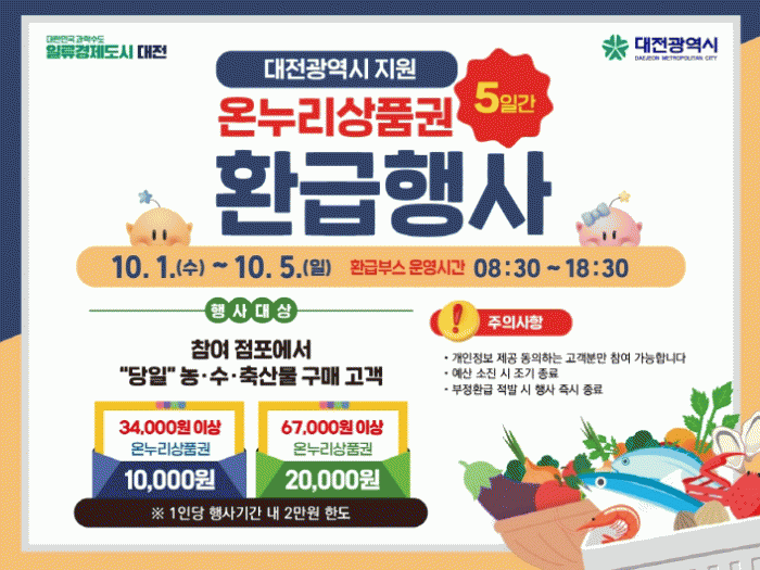 À̹ø Çà»ç´Â ³ó¸²Ãà»ê½ÄǰºÎ¡¤Çؾç¼ö»êºÎ°¡ ÁÖ°üÇÏ´Â Àü±¹ ȯ±ÞÇà»ç¿Í ¿¬°èÇØ ÃßÁøµÇ¸ç, ´ëÀü½Ã¹ÎÀÌ ´õ ¸¹Àº ÇýÅÃÀ» ü°¨ÇÒ ¼ö ÀÖµµ·Ï Áö¿ª ÀüÅë½ÃÀå¿¡¼ º°µµ ¿î¿µµÈ´Ù.