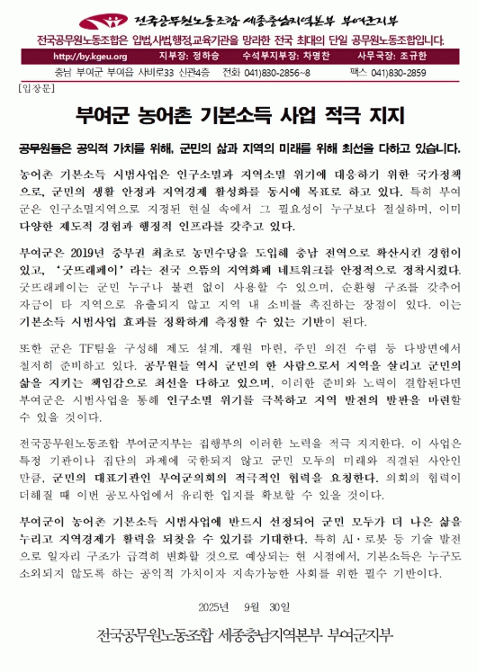 °ø¹«¿ø³ëÁ¶ ºÎ¿©±ºÁöºÎ´Â Àǰ߹®¿¡¼ ¡°ºÎ¿©±º °ø¹«¿øµéÀº °øÀÍÀû °¡Ä¡¸¦ À§ÇØ, ±×¸®°í ±º¹ÎÀÇ »î°ú Áö¿ªÀÇ ¹Ì·¡¸¦ À§Çؼ ÃÖ¼±À» ´ÙÇϰí ÀÖ´Ù.¡±¶ó¸ç, ¡°À̹ø »ç¾÷Àº ƯÁ¤ ±â°üÀ̳ª Áý´ÜÀÇ °úÁ¦°¡ ¾Æ´Ï¶ó ±º¹Î ¸ðµÎÀÇ ¹Ì·¡¿Í Á÷°áµÈ »ç¾ÈÀÎ ¸¸Å, ±º¹Î ¿©·¯ºÐÀÇ ÁöÁö¿Í ºÎ¿©±ºÀÇȸÀÇ Çù·ÂÀ» ¿äûÇÑ´Ù.¡±¶ó°í °Á¶Çß´Ù.