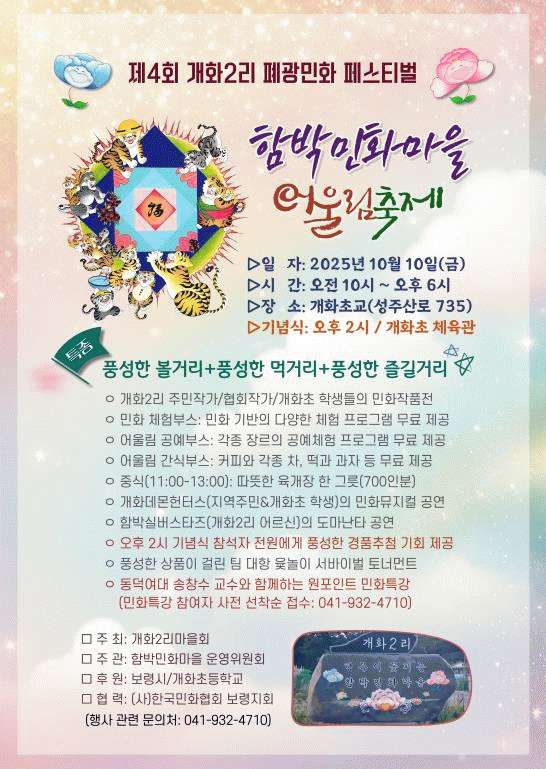 À̳¯ Çà»ç´Â °³È2¸® ¸¶À»È¸ ÁÖÃÖ, ÇÔ¹Ú¹Îȸ¶À» ¿î¿µÀ§¿øÈ¸ ÁÖ°üÀ¸·Î ÁøÇàµÇ¸ç, °³È2¸® Áֹΰú Çùȸ ÀÛ°¡µéÀÇ ¹ÎÈÀÛǰ Àü½Ãȸ, ´Ù¾çÇÑ ¿øµ¥ÀÌ Å¬·¡½º ¹ÎÈüÇè, °¢Á¾ À帣ÀÇ °ø¿¹ üÇè Ȱµ¿, °³ÈÃÊ Çлýµé°ú ÁÖ¹ÎÀÌ ÇÔ²²ÇÏ´Â ¹ÎȹÂÁöÄà °ø¿¬ µîÀÌ ÁغñµÇ¾î ÀÖÀ¸¸ç, ½Ä»ç¿Í °£½Äµµ ¹«·á·Î Á¦°øµÈ´Ù.