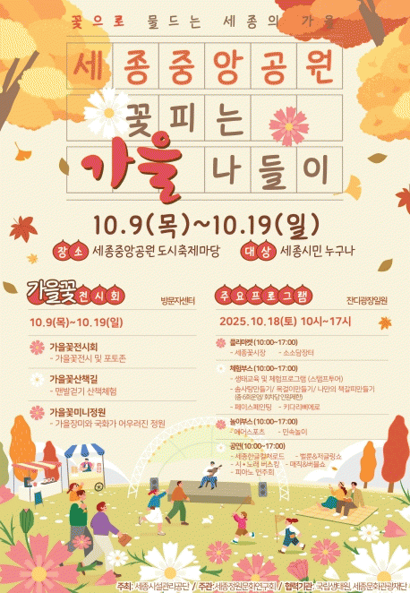 ¼¼Á¾Æ¯º°ÀÚÄ¡½Ã½Ã¼³°ü¸®°ø´ÜÀº ¿À´Â 10¿ù 9ÀϺÎÅÍ 19ÀϱîÁö ¼¼Á¾Áß¾Ó°ø¿ø µµ½ÃÃàÁ¦¸¶´ç ÀÏ¿ø¿¡¼ ¡®¼¼Á¾Áß¾Ó°ø¿ø ²ÉÇÇ´Â °¡À» ³ªµéÀÌ¡¯ Çà»ç¸¦ °³ÃÖÇÑ´Ù°í ¹àÇû´Ù.