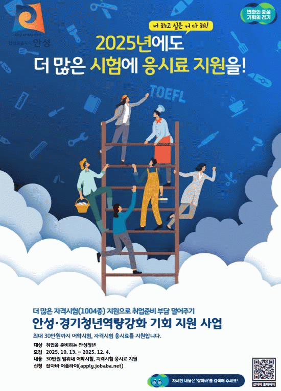 À̹ø Ãß°¡ ¸ðÁýÀº ¹ÌÃë¾÷ û³âÀÇ ¾îÇС¤ÀڰݽÃÇè ÀÀ½Ã ºñ¿ë ºÎ´ãÀ» ´ú¾î Ãë¾÷ Áغñ¿¡ ½ÇÁúÀûÀÎ µµ¿òÀ» ÁÖ±â À§ÇÑ °ÍÀ¸·Î, ¾È¼º½Ã¿¡ °ÅÁÖÇÏ´Â 19¼¼ºÎÅÍ 39¼¼±îÁöÀÇ Ã»³âÀÌ ½Åû ´ë»óÀÌ´Ù. ¿¬·ÉÀº 1985³â»ýºÎÅÍ 2006³â»ý±îÁö°¡ ÇØ´çµÇ¸ç, ½ÃÇè¿¡ ÀÀ½ÃÇÑ ´ç½Ã ¹ÌÃë¾÷ »óÅ¿´À½À» ÁõºùÇØ¾ß ÇÑ´Ù. °Ç°º¸Çè Á÷Àå°¡ÀÔÀÚ´Â ¿øÄ¢ÀûÀ¸·Î ´ë»ó¿¡¼ Á¦¿ÜµÇÁö¸¸, 1³â ¹Ì¸¸ÀÇ ´Ü±â °è¾à ±Ù·ÎÀÚ´Â ¹ÌÃë¾÷À¸·Î °£ÁÖÇØ ½ÅûÇÒ ¼ö ÀÖ´Ù.