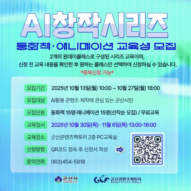 Âü¿© ½ÅûÀº 10¿ù 13ÀÏ¿¡¼ 27ÀϱîÁö ±º»ê½Ãû ¶Ç´Â ±º»êÄÜÅÙÃ÷ÆÑÅ丮 ´©¸®ÁýÀ» ÅëÇØ QR ºÎÈ£(ÄÚµå)·Î Á¢¼ö °¡´ÉÇϸç, ±³À° Âü°¡ ÀοøÀº µ¿ÈÃ¥ 15¸í, ¾Ö´Ï¸ÞÀÌ¼Ç 15¸íÀ¸·Î ¼±Âø¼ø ¸ðÁý ¿¹Á¤ÀÌ´Ù.