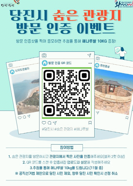 Âü¿© ¹æ¹ýÀº ¸éõÀ¾¼º ¶Ç´Â ³Áöµµ°ü±¤Áö¸¦ ¹æ¹®ÇØ ÇöÀå¿¡ ¼³Ä¡µÈ À̺¥Æ® È«º¸¹°ÀÇ Á¤º¸¹«´Ì(QRÄÚµå) »çÀÌÆ®¿¡ Á¢¼Ó ÈÄ, ¹æ¹® ÀÎÁõ»çÁø°ú °£´ÜÇÑ ÀÀ¸ð Á¤º¸¸¦ Á¦ÃâÇÏ¸é µÈ´Ù.