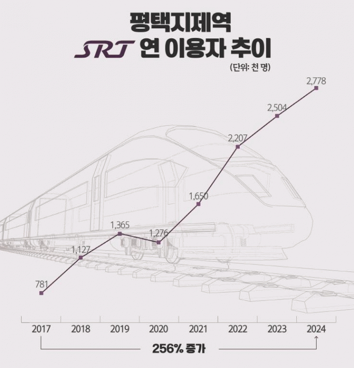 ÆòÅÃÁöÁ¦¿ªÀº 2016³â °³Åë ´ç½ÃºÎÅÍ SRT°¡ Á¤Â÷ÇÑ ¿ª»ç·Î, ¸Å³â À̿밴 ¼ö°¡ ²ÙÁØÈ÷ Áõ°¡Çϰí ÀÖ´Ù. ½ÇÁ¦ ¡®Ã¶µµ¿¬°¨¡¯¿¡ µû¸£¸é ÆòÅÃÁöÁ¦¿ªÀÇ ¿¬°£ SRT ½ÂÇÏÂ÷ ÀοøÀº 2017³â 78¸¸ 1õ ¸íÀ̾úÁö¸¸, 2024³â¿¡´Â 277¸¸ 8õ ¸íÀ¸·Î 256%ÀÇ Áõ°¡À²À» ±â·ÏÇß´Ù. ÀÌ·¯ÇÑ Áõ°¡À²Àº SRT ¿ª»ç Áß °¡Àå ³ôÀº ¼öÄ¡´Ù.
