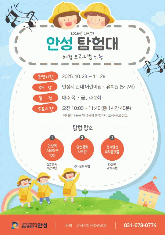 ¡®¾È¼º ŽÇè´ë¡¯´Â À¯¾Æ(5~7¼¼)µéÀÌ Áö¿ªÀÇ ¿ª»ç¿Í ¹®È¸¦ ½±°í Áñ°Ì°Ô ÀÌÇØÇÒ ¼ö ÀÖµµ·Ï ±âȹµÈ ÇÁ·Î±×·¥À¸·Î, ¾È¼º¿ª ½ºÅ×ÀÌ¼Ç 100, ¾È¼º¹®È»ç·á°ü, °æ±â¾È¼º¹ÂÁ÷Ç÷§Æû µî Áö¿ª ¹®È½Ã¼³À» ¿¬°èÇØ ÁøÇàµÈ´Ù.