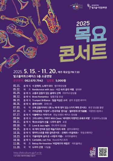 °ø¿¬ °ü·Ã Á¤º¸´Â ±¤ÁÖ¹®ÈÀç´Ü ȨÆäÀÌÁö, ºû°íÀ»½Ã¹Î¹®È°ü ȨÆäÀÌÁö, ±¤ÁÖ¹®È¿¹¼úÅëÇÕÇ÷§Æû ¡®µð¾î¸¶À̱¤ÁÖ¡¯¿¡¼ È®ÀÎÇÒ ¼ö ÀÖ´Ù. ¿¹¾à ¹× ¹®ÀÇ´Â ±¤ÁÖ¹®ÈÀç´Ü ºû°íÀ»½Ã¹Î¹®È°üÀ¸·Î ÇÏ¸é µÈ´Ù.