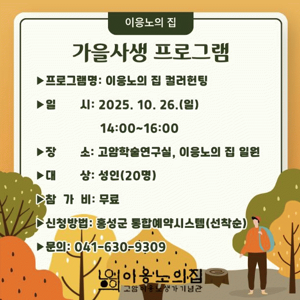 À̹ø ÇÁ·Î±×·¥Àº °¡À» Á¤Ãë°¡ ¹«¸£ÀÍÀº ÀÌÀÀ³ëÀÇ Áý ÁÖº¯ dz°æÀ» ¹è°æÀ¸·Î, Âü°¡ÀÚµéÀÌ Á÷Á¢ ÀڽŸ¸ÀÇ ½Ã¼±À¸·Î ÀÚ¿¬ÀÇ »ö°¨À» ´ã¾Æ³»´Â ¾ß¿Ü »ç»ý üÇèÀ¸·Î ±¸¼ºµÆ´Ù. °í¾Ï ÀÌÀÀ³ë ȹéÀÇ ¿¹¼ú Á¤½ÅÀ» µÇ»õ±â¸ç, ÀÚ¿¬ ¼Ó¿¡¼ âÀǼº°ú °¨¼ºÀ» ¹ßÈÖÇÒ ¼ö ÀÖ´Â ½Ã°£ÀÌ µÉ °ÍÀ¸·Î ±â´ëµÈ´Ù.