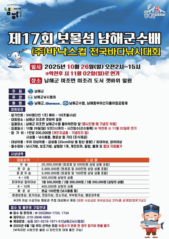 Âü°¡ÀÚµéÀº ³²Çرº¼öÇù Ȱ¾îÀ§ÆÇÀå ¾Õ¿¡¼ ¿ÀÀü 2½Ã Áý°á ¹× ¼±¼öµî·ÏÀ» ¸¶Ä£ ÈÄ, Ãß÷À» ÅëÇØ ÁöÁ¤µÈ Æ÷ÀÎÆ®·Î À̵¿ÇØ °æ±â¸¦ Ä¡¸¥´Ù. ´ë»ó ¾îÁ¾Àº ³²ÇرºÀÇ ±º¾î(ÏÛåà)ÀÎ °¨¼ºµ¼À̸ç, 25cm ÀÌ»ó ¾îÁ¾ÀÇ ÇÕ»ê Áß·®À¸·Î ¼øÀ§°¡ °áÁ¤µÈ´Ù. ¿ì½ÂÀÚ¿¡°Ô´Â »ó±Ý 2,000¸¸ ¿ø°ú Æ®·ÎÇǰ¡ ¼ö¿©µÇ¸ç, ÁØ¿ì½Â¡¤ÃÖ´ë¾î»ó¡¤Àâ¾î´ë»ó¡¤È¯°æº¸È£»ó¡¤ºÎºÎÂü°¡»ó¡¤ÃÖ¿¬ÀåÀÚ»ó¡¤ÃÖ¿¬¼ÒÀڻ󡤿ø°Å¸®»ó¡¤Çà¿î»ó µî ´Ù¾çÇÑ ºÎ¹®¿¡ ´ëÇÑ ½Ã»ó°ú Çà¿î±Ç Ãß÷µµ ÁøÇàµÉ ¿¹Á¤ÀÌ´Ù.