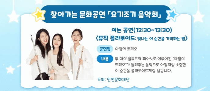 °ø¿¬¿¡´Â ¡®¾ÆÄ§ÀÇ Æ®¸®¿À¡¯°¡ Âü¿©ÇØ µÎ ´ëÀÇ ÇÃ·çÆ®¿Í ÇÑ ´ëÀÇ ÇǾƳë·Î ±¸¼ºµÈ Æí¾ÈÇÏ°í ½Ì±×·¯¿î À½¾ÇÀ» ¼±º¸ÀÏ ¿¹Á¤ÀÌ´Ù.