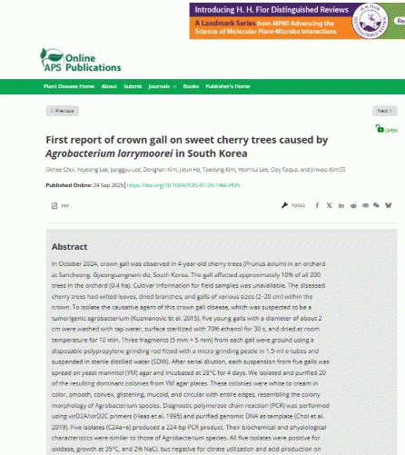 ÀÌ °á°ú ±¹³»¿¡¼´Â óÀ½À¸·Î ü¸®¿¡¼ ¹ß»ýÇÑ È¤º´(Agrobacterium larrymoorei)ÀÌ ±Ô¸íµÅ ±¹Á¦ ÇмúÁö(Plant Disease)¿¡ º¸°íµÆ´Ù.