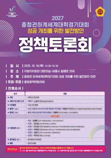 À̾îÁö´Â ÁöÁ¤Åä·Ð¿¡¼´Â 2027 ÃæÃ»±Ç U´ëȸ, Áö¿ª±ÕÇü¹ßÀü°ú ÇàÁ¤ÅëÇÕÀÇ ±âȸ, ÇàÁ¤¼öµµ ¼¼Á¾ ¿Ï¼º°ú 2027 ÃæÃ»±Ç Çϰ輼°è´ëÇаæ±â´ëȸÀÇ ÀÇÀÇ, 2027 ÃæÃ»±Ç ÇϰèÀ¯´Ï¹ö½Ã¾Æµå ¼º°ø °³ÃÖ¿Í º¹¼ö ¼±¼öÃÌ ¿î¿µ ¹æ¾È, ¿¬¼ÓµÈ °æÇè ¿©Á¤ÀÇ ¼³°è, ·¹°Å½Ã º¸Á¸¹æ¾È°ú ½ºÆ÷Ã÷°ü±¤ ÄÜÅÙÃ÷·Î ¹ßÀü ¹æ¾È ¸ð»ö µî¿¡ ´ëÇØ ´Ù¾çÇÑ ÀǰßÀ» ³ª´ ¿¹Á¤ÀÌ´Ù.