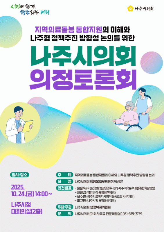 Åä·Ðȸ´Â ¹Ú¼ºÀº ³ªÁÖ½ÃÀÇȸ ÇàÁ¤º¹ÁöÀ§¿øÈ¸ ºÎÀ§¿øÀåÀÌ ÁÂÀåÀ» ¸Ã¾Æ ÁøÇàµÇ¸ç, ÃÖÁ¡¼÷ ±¹¹Î°Ç°º¸Çè°ø´Ü ±¤ÁÖ¡¤Àü¶ó¡¤Á¦ÁÖÁö¿ªº»ºÎ µ¹º½ÅëÇÕÁö¿øÆÀÀå, ÁøÇѰâ Àü¶ó³²µµ ¿µ¾Ï±ºÃ» ÅëÇÕÁ¤Ã¥ÆÀÀå, ¼¼ö¿¬ ±¤ÁÖÀǷẹÁö»çȸÀûÇùµ¿Á¶ÇÕ »ç¹«Ã³Àå, À̱ԹΠ³ªÁÖ½Ãû ÅëÇÕµ¹º½ ÆÀÀåÀÇ Àǰ߹ßÇ¥·Î ÁøÇàµÉ ¿¹Á¤ÀÌ´Ù.