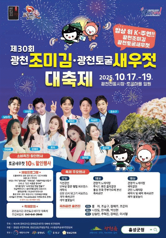 ÃàÁ¦ ù³¯ÀÎ 17ÀÏÀº È·ÁÇÑ °³¸·½Ä°ú È«ÀÚ, Á¶½Â±¸ µî ÀαⰡ¼öµéÀÇ ÃàÇϰø¿¬, ±×¸®°í ¹ãÇÏ´ÃÀ» ¼ö³õÀ» ¾ß°£ ºÒ²É³îÀ̰¡ ù³¯ ¹ãÀ» È·ÁÇÏ°Ô Àå½ÄÇϰí, 18ÀÏ Åä¿äÀÏÀº ¡®Á¦12ȸ È«¼º Àü±¹Áֺΰ¡¿äÁ¦¡¯ º»¼±°ú ³ª»óµµ, ÇÑ¿©¸§ÀÇ ¶ß°Å¿î ¹«´ë°¡ À̾îÁö¸ç, ¸¶Áö¸· ³¯ÀÎ 19ÀÏ ÀÏ¿äÀÏ¿¡´Â ±º¹Î ³ë·¡ÀÚ¶û°ú ³²½Â¹Î, ÃßÇõÁø µî ÀαⰡ¼öÀÇ Æó¸· ÃàÇϰø¿¬, ´ë¹Ì¸¦ Àå½ÄÇÒ ¾ß°£ ºÒ²É³îÀÌ·Î ¸¶¹«¸® µÉ ¿¹Á¤ÀÌ´Ù.