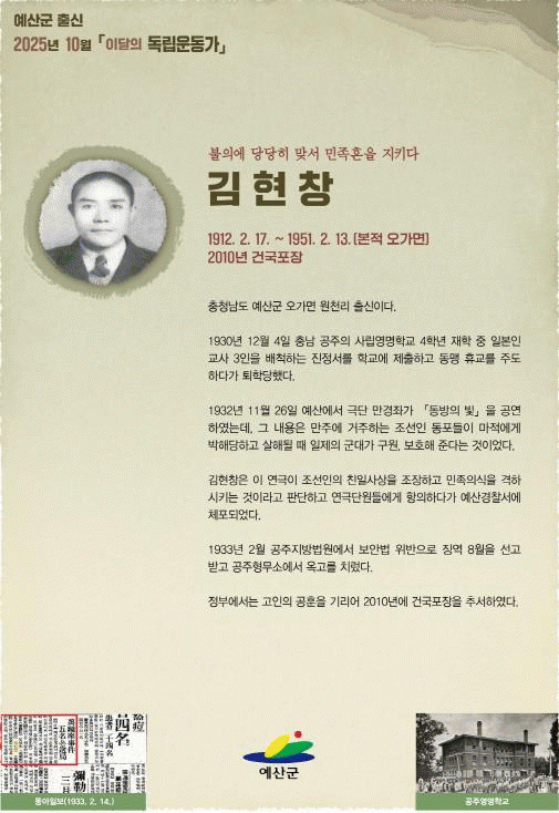 ±ºÀº ±¹°¡º¸Èƺΰ¡ ¼±Á¤ÇÑ µ¶¸³¿îµ¿°¡ Áß ¿¹»ê Ãâ½Å Àι°À» ¸Å¿ù ¡®ÀÌ´ÞÀÇ µ¶¸³¿îµ¿°¡¡¯·Î ¼±Á¤ÇØ Æ÷½ºÅ͸¦ Á¦ÀÛ¡¤¹èÆ÷Çϰí ÀÖÀ¸¸ç, Æ÷½ºÅÍ´Â °ü³» ÃÊ¡¤Áß¡¤°íµîÇб³, º¸ÈÆÈ¸°ü, °ø°ø±â°ü, ±ÝÀ¶±â°ü, ±ºÃ» ´©¸®Áý µî¿¡ °Ô½ÃµÅ ¼±¿ÀÇ ¶æ°ú ¾÷ÀûÀ» ³Î¸® ¾Ë¸®°í ÀÖ´Ù.
