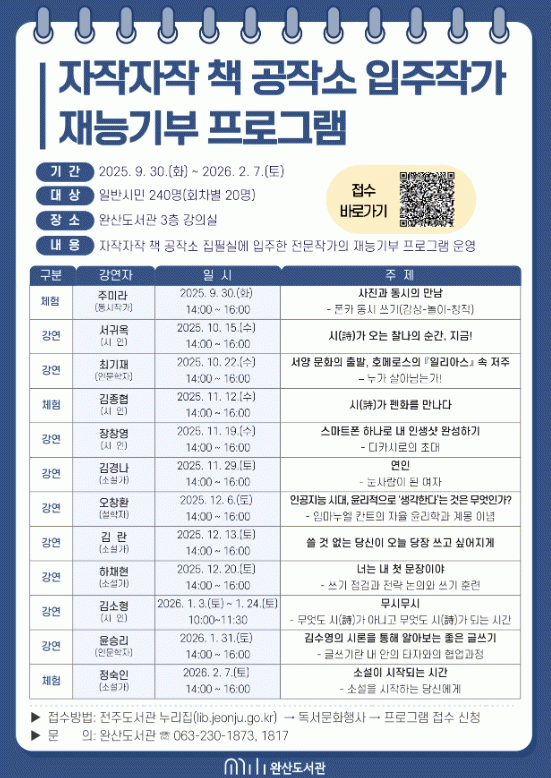 À̹ø ÇÁ·Î±×·¥Àº ½Ã¹Î ´©±¸³ª ¹«·á·Î Âü¿©ÇÒ ¼ö ÀÖÀ¸¸ç, Âü°¡ ½ÅûÀº °¿¬ ½ÃÀÛ 2ÁÖ ÀüºÎÅÍ ÀüÁֽø³µµ¼°ü ´©¸®Áý(lib.jeonju.go.kr)À» ÅëÇØ Á¢¼öÇÏ¸é µÈ´Ù. ±âŸ ÀÚ¼¼ÇÑ »çÇ×Àº ¿Ï»êµµ¼°ü(063-230-1873)À¸·Î ¹®ÀÇÇÏ¸é µÈ´Ù.
