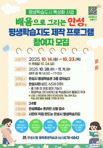 ±³À°Àº ÃÑ 5ȸÂ÷·Î ÁøÇàµÇ¸ç, ¾È¼º½Ã Æò»ýÇнÀ Á¤Ã¥ ÀÌÇØ¿Í ±â°ü ½ÇÅÂÁ¶»ç ¼³°è¸¦ ½ÃÀÛÀ¸·Î Áö¿ª ÇнÀÀÚ¿ø Á¶»ç, ±Ç¿ªº° ÀÚ¿ø ±â¹Ý ÇнÀÁöµµ Á¦ÀÛ ¿öÅ©¼ó µîÀ¸·Î ±¸¼ºµÈ´Ù. Âü¿©ÀÚµéÀº Á÷Á¢ Á¶»çÇÑ ÀڷḦ Åä´ë·Î ½Ç¹°°ú µðÁöÅÐ ÇüÅÂÀÇ ÇнÀÁöµµ¸¦ ¿Ï¼ºÇϰí, ¿Ï¼ºµÈ °á°ú¹°Àº ÇâÈÄ ½Ã¹Î È«º¸¿Í Á¤Ã¥ÀÚ·á·Î Ȱ¿ëµÉ ¿¹Á¤ÀÌ´Ù.