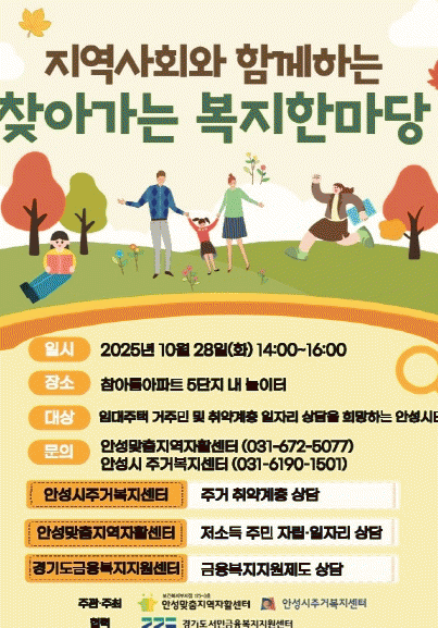 ¾È¼º½ÃÁְź¹Áö¼¾ÅÍ´Â ÁÖ°Å Ãë¾à°èÃþ ¹× ÁÖ°Å»óÇâ °ü·Ã »ó´ãÀ» ´ã´çÇϰí, ¾È¼º¸ÂÃãÁö¿ªÀÚȰ¼¾ÅÍ´Â ÀÚȰ»ç¾÷ ¾È³»¿Í ÀÏÀÚ¸® »ó´ã,