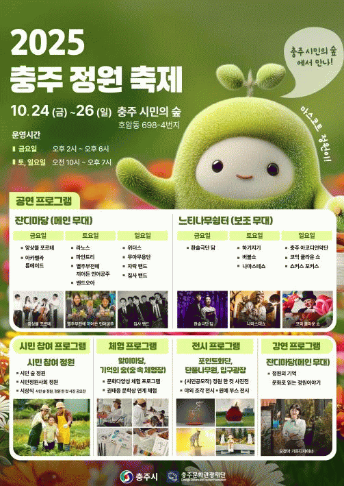 2025 ÃæÁÖ Á¤¿ø ÃàÁ¦´Â ¿À´Â 10¿ù 24ÀÏ¿¡´Â ¿ÀÈÄ 2½ÃºÎÅÍ ¿ÀÈÄ 6½Ã±îÁö ¿î¿µµÇ¸ç, 10¿ù 25Àϰú 26ÀÏÀº ¿ÀÀü 10½ÃºÎÅÍ ¿ÀÈÄ 7½Ã±îÁö ÁøÇàµÈ´Ù.